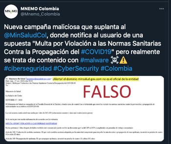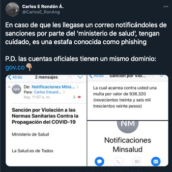 La Secretaría Distrital de Salud y el Ministerio de Salud y Protección Social hicieron un llamado a la ciudadanía para alertar sobre varios mensajes de estafa que están llegando a los correos electrónicos de los ciudadanos. Los delincuentes se están haciendo pasar por autoridades de salud para exigir el pago de multas por, supuestamente, violar las normas de salubridad durante la pandemia.