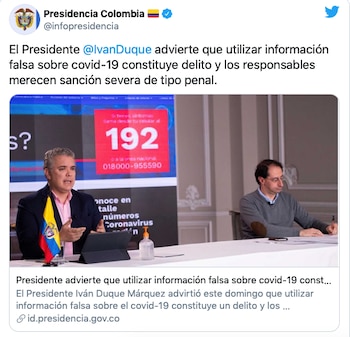 Recordemos que el presidente Iván Duque anunció que se le está prestando atención a la información falsa que se distribuye sobre el covid -19 y que las personas que estén involucradas recibirán sanciones millonarias, por acabar con la tranquilidad de los ciudadanos.