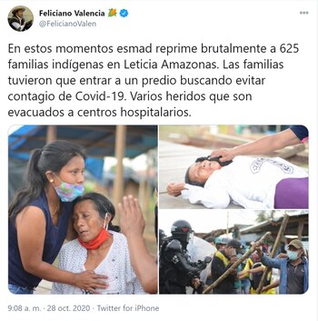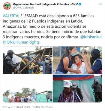 Finalmente, desde la Organización Nacional Indígena de Colombia (ONIC), también denunciaron los hechos de violencia registrados en Leticia. “El ESMAD está desalojando a 625 familias indígenas de 12 Pueblos Indígenas en Leticia, Amazonas. En medio de esta acción violenta se registran varios heridos. Se tiene indicio de que habrían 3 indígenas muertos, noticia por confirmar”, dijeron desde la ONIC.