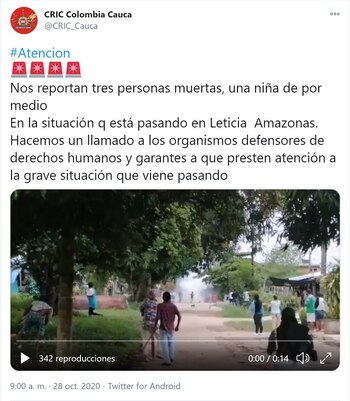 Desde el CRIC también pidieron presencia de los órganos de control en la zona. “Nos reportan tres personas muertas, una niña de por medio en la situación que está pasando en Leticia, Amazonas, hacemos un llamado a los organismos defensores de derechos humanos y garantes a que presten atención a la grave situación que viene pasando”, dijo la CRIC desde su cuenta de Twitter.