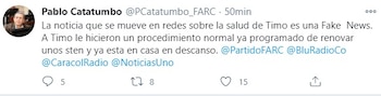 “La noticia que se mueve en redes sobre la salud de ‘Timo’ es una fake news'”, escribió Catatumbo en su cuenta de Twitter y afirmó que Londoño ya estaría en su casa descansando.