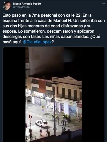 A través de un video en redes sociales, la periodista María Antonia ‘Nany’ Pardo denunció que en la calle 22 con séptima, en Bogotá, una patrulla de la Policía detuvo a un hombre que iba con sus dos hijas, y después de someterlo, le quitaron la camiseta, y frente a las pequeñas, le hicieron descargas con ‘teaser’.