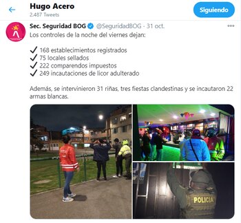 Frente a las intervenciones, el secretario de Seguridad, Hugo Acero, afirmó: "Lo primero que hay que destacar es el buen comportamiento de las familias y personas que viven en Bogotá (...). Sin embargo, encontramos algunos que infringieron normas. Vamos a seguir controlando estas aglomeraciones por bioseguridad y también para garantizar la tranquilidad de los habitantes de la ciudad”.