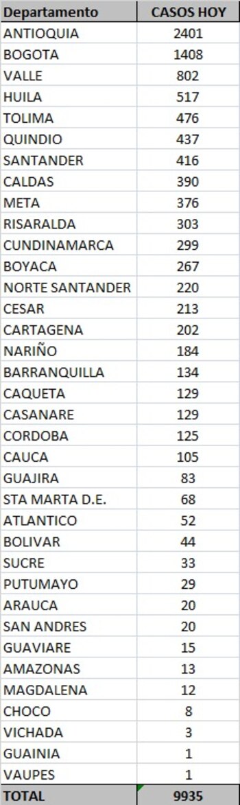 En cuanto a los contagios de covid-19 por ciudades y departamentos del país, Antioquia y Bogotá siguen llevando la delantera, seguidos por Valle del Cauca, Huila y Tolima.