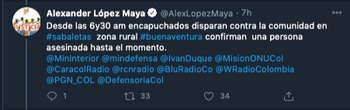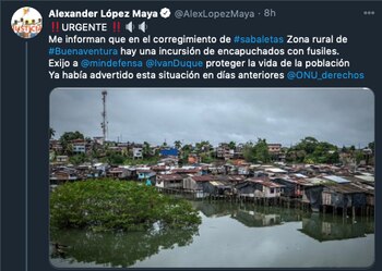 El senador del Polo Democrático Alexander López Maya denunció a través de redes sociales lo que estaba ocurriendo en el sector y publicó información en su Twitter para solicitar ayuda por parte de las autoridades.