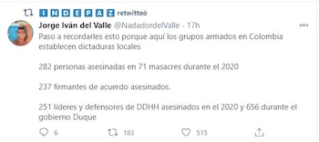 “Estamos hablando de grupos armados cuyas finanzas se vieron afectadas por la cuarentena, al no poder distribuir la droga o extorsionar: los aeropuertos y las vías estaban cerradas, y los puertos marítimos tenían mayores controles. Por ello, se volcaron a consolidar el control en sus territorios”, analiza Trejos acerca del fenómeno de las masacres y el asesinato de líderes sociales durante este año.