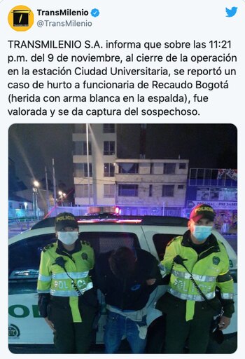 “Al cierre de la operación en la estación Ciudad Universitaria, se reportó un caso de hurto a funcionaria de Recaudo Bogotá (herida con arma blanca en la espalda), fue valorada y se da captura del sospechoso”, aseguró el Sistema de transporte a través de sus redes sociales.