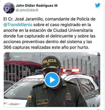 El coronel José Óscar Jaramillo, comandante de la Policía de Transmilenio, aseguró que, “gracias a la ayuda de los guardas de seguridad y la oportuna atención de la Policía Nacional se logró la captura de este ciudadano, recuperándole el bolso y trasladando a esta señora a la Clínica Méderi porque presenta una herida en el omóplato izquierdo”.