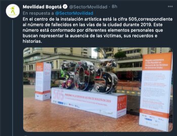 “El objetivo de esta intervención es recordarle a la opinión pública que, detrás de esta gran cifra, están las historias de 505 personas: padres, abuelos, hijas e hijos, nietas y nietos, hermanos y hermanas que durante el 2019 no regresaron a sus casas y ya no están con sus seres queridos a causa de un siniestro vial”, aseguró la Secretaría de Movilidad en el comunicado.