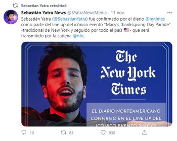 Se trata de los artistas de música urbana Karol G y Sebastián Yatra. “Me presentaré en el Día de Acción de Gracias de Macy”, escribió el cantante en su cuenta de Twitter.
