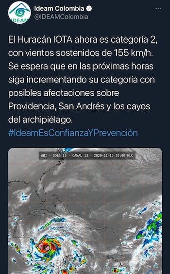 En los últimos minutos el IDEAM confirmó que el Huracán IOTA ya se encuentra en categoría 2, con vientos sostenidos de 155 km/h. Se espera que en las próximas horas siga incrementando su categoría con posibles afectaciones sobre Providencia, San Andrés y los cayos del archipiélago.