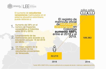 Según el análisis, entre 2018 y 2019, el registro de matrícula oficial en la educación preescolar, básica y media de estudiantes venezolanos en Colombia aumentó un 488%, pasando de 32.213 a 189.382 estudiantes.