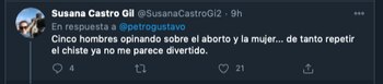 Por otro lado, las críticas no dejaron de llegar, pues en el video que compartió, en donde muestra su postura frente al aborto, solo se ven cinco senadores hablando de temas de mujer sin ninguna figura femenina opinando al respecto.
