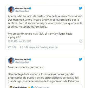 Por su parte, el exmandatario distrital Gustavo Petro manifestó que Bogotá se encuentra sometida a “los intereses de los grandes propietarios de buses y de los especuladores de tierras” que, según el ahora senador, fueron los principales beneficiados en los mandatos de Enrique Peñalosa.