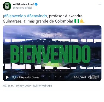 Alexandre Guimaraes se acaba de convertir en el nuevo entrenador de Atlético Nacional y su trabajo comenzará desde enero. Así lo anunció el equipo en su Twitter oficial.
