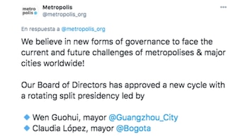 Este nombramiento convierte a la alcaldesa Claudia López en la primera mujer latinoamericana presidente de metrópolis®.