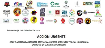 “La compañera Nini Johana Cárdenas desarrolla el liderazgo en este municipio para la defensa del territorio, la naturaleza y la vida, mediante la denuncia de proyectos extractivistas en la región, que han afectado o pueden llegar a afectar la fauna y flora, fuentes hídricas, los cultivos así como demás bienes colectivos de quienes viven en el municipio”, señalan las organizaciones que a través de un comunicado piden acción urgente para salvaguardar la vida de esta mujer.