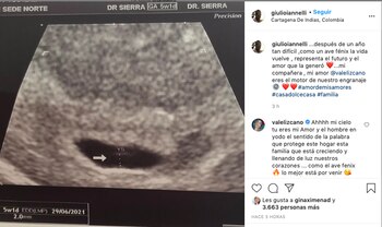 Por su parte, Giulio Iannelli, novio de Valentina, también compartió la noticia a través de sus redes sociales y, acompañó la imagen de la ecografía con esta dedicatoria: “después de un año tan difícil, como un ave fénix la vida vuelve , representa el futuro y el amor que la generó...mi compañera , mi amor @valelizcano eres el motor de nuestro engranaje”.