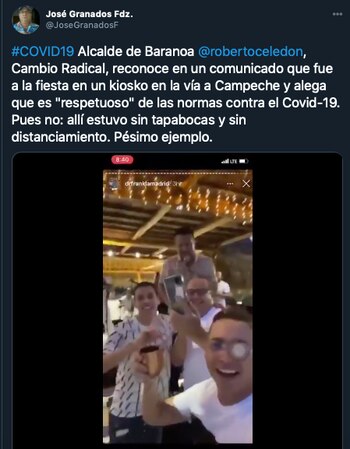 El hecho causó gran indignación en los habitantes de Baranoa, quienes se pronunciaron en rechazo a un video que se hizo viral, en donde se ve a Roberto Celedón, alcalde del municipio, en medio de una celebración, con varias personas más y, de paso, incumpliendo los protocolos de bioseguridad pues ninguno llevaba tapabocas o mantenía la distancia.