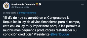 El presidente Iván Duque, junto con el ministro de Agricultura y Desarrollo Rural, hablaron sobre la aprobación de esta iniciativa, que busca hacer valer las medidas financieras para aliviar las obligaciones que estén en mora de pequeños y medianos productores agropecuarios, pesqueros, acuícolas, forestales y agroindustriales, afectados por la pandemia y quienes no tuvieron ingresos en los últimos meses.