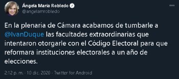 Al respecto, informó Caracol Radio, la representante Ángela María Robledo comentó: “Lo advertimos desde el primer debate en Comisión Primera, el despropósito de lo que significaba entregar facultades extraordinarias al presidente Iván Duque. Nos alegra que la sensatez haya llegado a nuestros colegas en la Plenaria de la Cámara y se haya aceptado eliminar las facultades extraordinarias para el presidente”.