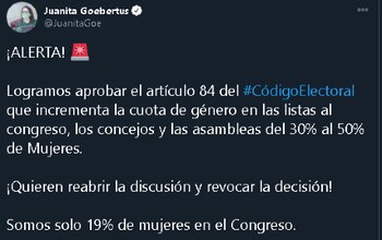 De igual forma, pasó con visto bueno el artículo 84 que incrementa la cuota de género en las listas al congreso, los concejos y las asambleas del 30% al 50% de mujeres. Según Goebertus, sin embargo, la plenaria estaba buscando reabrir la discusión para revocar dicha decisión. La representante también recordó que el Congreso actual solo cuenta con un 19 % de mujeres.