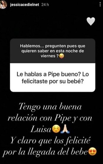 “Tengo una buena relación con Pipe y con Luisa. Y claro que los felicité por la llegada del bebé”, aseguró Jessica a través de sus historias en Instagram.