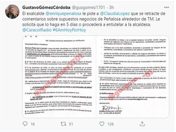 La disputa empezó el pasado 11 de diciembre, cuando el director del bloque informativo de Caracol Radio, Gustavo Gómez, dio a conocer una carta en la que Enrique Peñalosa citó una entrevista que la actual alcaldesa de Bogotá, Claudia López, le concedió a la revista Semana y en la que lo catalogó como dueño de TransMilenio e insinuó que el sistema de transporte es un juguete del exalcalde. Frente a esto, Peñalosa le solicitó a López una rectificación, puntualizando que sus afirmaciones afectan su buena honra.