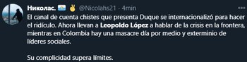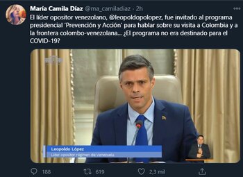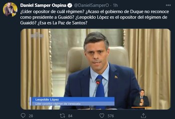 “¿Líder opositor de cuál régimen? ¿Acaso el gobierno de Duque no reconoce como presidente a Guaidó? ¿Leopoldo López es el opositor del régimen de Guaidó? ¿Esa es La Paz de Santos?”, escribió el columnista en su cuenta de Twitter.