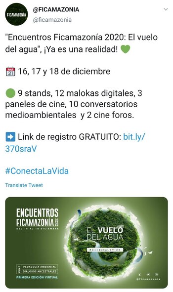 “El cambio climático es una realidad, un asunto de todos y no da espera. Ahora más que nunca, es indispensable volcar nuestra mirada hacia el bioma amazónico; hay que encontrarse con él, reflexionar y actuar. Estos encuentros tienen un componente innovador muy atractivo, los participantes podrán sentirse más de cerca de la Amazonía a través de una plataforma de modelado virtual 360º, en donde podrán caminar e interactuar y acceder a los contenidos dentro del campus amazónico por medio de un avatar”, afirmó en el comunicado Linithd Aparicio Blackburn, directora de la Fundación Ficamazonía y del Festival internacional de cine y ambiente itinerante de la Amazonía.
