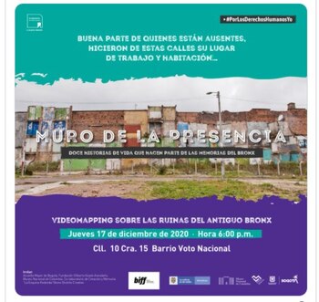 El homenaje consiste en un videomapping compuesto por 12 retratos de quienes, pese a que habitaron el Bronx durante décadas, desaparecieron. En el proceso de esta construcción artística participaron actores comunitarios que compartieron con ellos en las calles o en los pagadiarios de ese centro de Bogotá al que llegaron consecuencia de procesos de exclusión