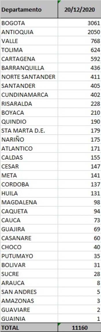 El Ministerio de Salud y Protección Social reportó, este domingo 20 de diciembre, 11.160 casos nuevos de coronavirus en Colombia. En las últimas 24 horas se procesaron 43.635 pruebas de las cuales son: PCR: 31.183 y antígenos: 12.452.