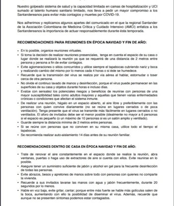 “Nuestro golpeado sistema de salud y la capacidad limitada en camas de hospitalización y UCI sumado al talento humano sanitario limitado, nos lleva a pedir un mayor compromiso a los santandereanos para evitar más contagios y muertes por COVID-19, existen falencias principalmente uso inadecuado del tapabocas y falencias en el distanciamiento social, está llevando a una creciente vertiginosa del número de contagios y ocupación de camas que en el lapso de pocos días podría traducirse en un colapso del sistema sanitario a nivel departamental”.