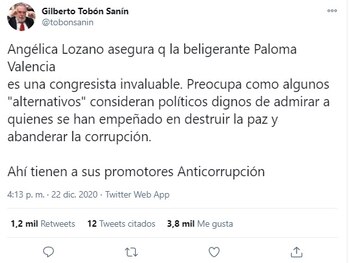 “Angélica Lozano asegura que la beligerante Paloma Valencia es una congresista invaluable. Preocupa como algunos “alternativos” consideran políticos dignos de admirar a quienes se han empeñado en destruir la paz y abanderar la corrupción”, escribió el analista político Gilberto Tobón Sanín.