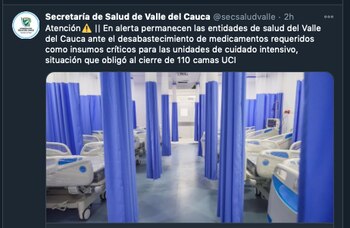 “Tenemos 110 camas cerradas hoy en el departamento por escasez de medicamentos. Se trata de medicamentos relajantes y sedantes que no hay en el país, ni en el mundo. Hay un desabastecimiento que es evidente y obliga al cierre de camas de UCI que es lo que necesitamos tener abierto”, aseguró la secretaria de Salud del Valle, María Cristina Lesmes a través de un comunicado de prensa.