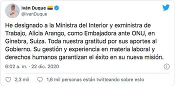 Sin embargo, solo hasta este martes 22 de diciembre, el presidente Iván Duque confirmó, en su cuenta de Twitter, la salida de Arango, quien pasará a ser la embajadora del país ante la Organización de las Naciones Unidas en Ginebra, Suiza, en reemplazo de Adriana Mendoza, quien fue traslada a Finlandia, pese a que en la Procuraduría tiene una investigación preliminar por pasar gastos personales como gastos de representación.