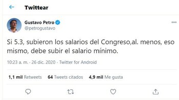 El líder de la Colombia Humana, Gustavo Petro, coincide con Humberto de la Calle. Según Petro, si se subió un 5% el salario de los congresistas “al menos, eso mismo debe subir el salario mínimo”.
