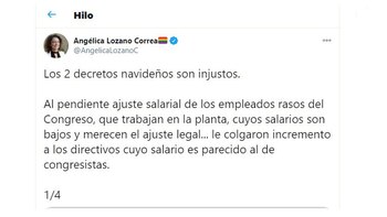 La senadora Angélica Lozano también realizó un hilo en Twitter en el que argumentó que “el decreto que aumenta el salario de los congresistas, prueba una vez más, que el monto es desproporcionado y ajeno a la realidad del trabajador colombiano”, y, agregó, “la fórmula de incremento está mal, potencia la brecha, tenemos que cambiarla y bajar el salario de los congresistas”.