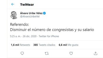 Al expresidente Álvaro Uribe, por otro lado, le llueven críticas por colocar un trino en el que dijo: “Referendo: Disminuir el número de congresistas y su salario”, después de que se conociera que el sueldo de estos funcionarios subirá. Muchos de los usuarios de la red social lo critican por publicar eso cuando su candidato, Iván Duque, como Presidente de la república realizó lo contrario.