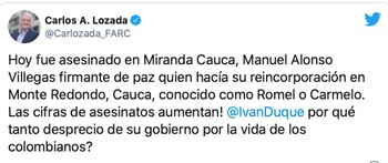 Por su parte, Carlos Alberto Lozada, congresista del partido Farc, le escribió al presidente Iván Duque, preguntándole “¿Por qué tanto desprecio de su Gobierno por la vida de los colombianos?”, esto mientras compartía las cifras de asesinatos contra los firmantes del Acuerdo de Paz, que aumentan cada día más.