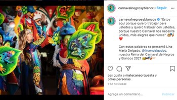“Aquí comienza una nueva historia del Carnaval de Negros y Blancos 2021, la virtualidad será la mejor aliada para acercar por primera vez a todos los pastusos, nariñenses, colombianos y extranjeros, sin excepción, a cada actividad programada. Estaremos a un clic de disfrutar de toda la magia, la música y la gran calidad de trabajo que encierra nuestro carnaval”, manifestó Corpocarnaval.