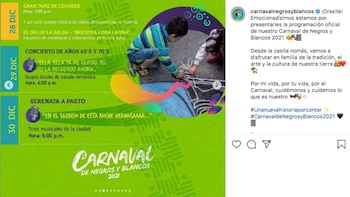 Es el caso del Carnaval de Negros y Blancos, la fiesta más grande del departamento de Nariño, que para su edición 2021 tuvo que volcar todas las actividades al entorno digital. El evento se está llevando a cabo desde el 16 de diciembre con talleres y encuentros, que hacen de esta versión una plataforma con ofertas para todos los gustos y edades.