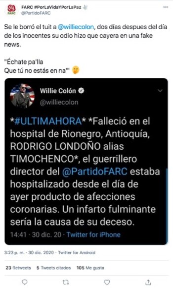 Minutos después, Colón borró el trino debido a que la noticia que rondaba desde el pasado 28 de diciembre sobre la muerte del exguerrillero era una inocentada. Sin embargo, muchos alcanzaron a ver el mensaje, incluso algunos tomaron un pantallazo, entre ellos, integrantes del partido de las Farc.