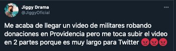 “Me acaba de llegar un video de militares robando donaciones en Providencia pero me toca subir el video en 2 partes porque es muy largo para Twitter”, comentó Drama.