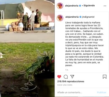 “Llevo trabajando toda la mañana para ver cómo logro llevar las 23 toneladas de ayudas a Providencia, con mil trabas... hablando con el uno con el otro. Se bajan, se suben. Es demasiado triste... ¿y después ve uno esto?”, aseguró en sus redes sociales.