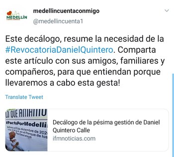 Ayer, primero de enero fue tendencia en Twitter el #AdiosDanielQuintero, promovido principalmente por el grupo detractor Medellín Cuenta Conmigo, quienes anunciaron en RCN Radio que irán ante la Registraduría, en la sede de las torres de Bomboná, para adelantar la diligencia.