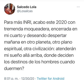 Luego de su muerte se conoció un mensaje publicado en su cuenta de Twitter @losalcas que, parece, advertía lo que iba ocurrir: “Para más INRI, acabo este 2020 con tremenda moqueadera, encerrada en mi cuarto y deseando despertar mañana en otro planeta, otro plano espiritual, otra civilización: atenderán mis sueños allá arriba, donde deciden los destinos de los hombres cuando duermen”.
