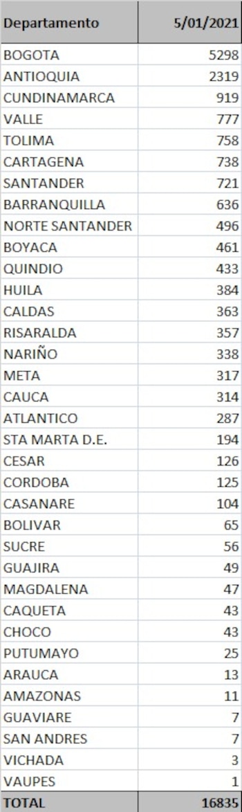 El Ministerio de Salud y Protección Social reportó, este martes 5 de enero de 2021, 16.835 casos nuevos de coronavirus en Colombia. En las últimas 24 horas se procesaron 65.823 pruebas de las cuales 33.564 son PCR y 32.354 de antígenos.