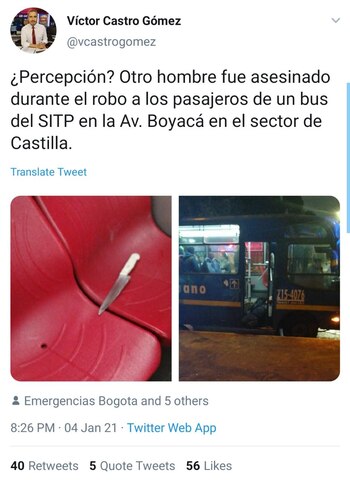 “Es un lamentable hecho que se nos presenta sobre las 19:00 horas, donde de acuerdo a los testimonios de los pasajeros, se suben dos delincuentes al bus, pretendiendo hurtar a los pasajeros. Los delincuentes le roban los celulares a algunos de ellos y una de las personas que iba en el bus, le quita el arma a uno de los delincuentes y con esta misma lo lesiona”, afirmó el mayor general Óscar Gómez comandante de la Policía Metropolitana de Bogotá.