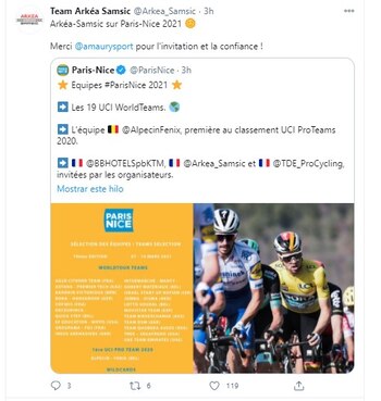El comité de la París-Niza fue el que dio a conocer al Arkea-Samsic como de uno de los equipos invitados a la competencia, al igual que el Team Total Direct Energie, pues, al tratarse de escuadras de segunda división, requieren que los organizadores de las carreras World Tour les conviden para poder participar. Sin embargo, la presencia de Nairo en esta reconocido evento del ciclismo parecer estar descartada.